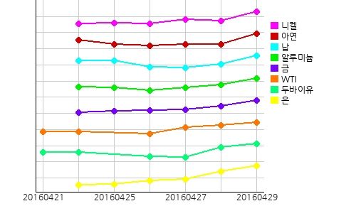 국제 원자재 시장에서 WTI(서부텍사스산원유)의 현물시세가 전일 대비 1.27 달러 오른 배럴당 46.03 달러를 기록했고, 두바이유 현물시세는 전일 대비 0.63 달러 오른 배럴당 43.22 달러를 기록했다.금 현물시세는 전일 대비 27.46 달러 오른 온스당 1293.5 달러를 기록했고, 은 현물시세도 전일 대비 0.26 달러 오른 온스당 17.83 달러를 기록했다.주요광물시세는 주석이 전일 대비 톤당 344.5 달러 올라 17418.5 달러를 기록했고 니켈, 아연, 납, 알루미늄 모두 상승세를 보였다.환율
