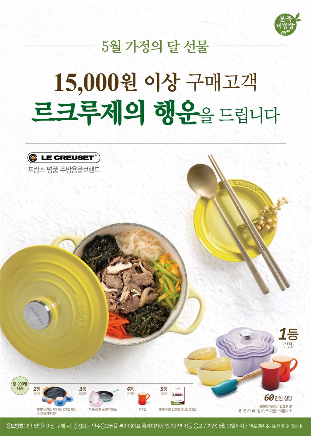 [아시아경제 오주연 기자]본죽&비빔밥카페가 프랑스 명품 주방용품 브랜드 르크루제의 행운을 전하는 ‘경품 증정 이벤트’를 진행한다고 3일 밝혔다.오는 5일부터 31일까지 본죽&비빔밥카페 매장을 방문해 1만5000원 이상 구매하는 고객을 대상으로 진행되며 추첨을 통해 총 200명에게 프랑스 명품 주방용품 브랜드인 르크루제 제품을 비롯해 본아이에프 모바일 상품권을 증정한다. 매장에서 전달받은 응모권을 홈페이지에 등록하면 이벤트에 자동 응모되며, 응모권은 조기에 소진될 수 있다. 1등(1명)에게는 플라워 주물냄비 1개, 밥그릇 2개, 국그릇 2개, 머그컵(소) 2개, 쁘띠핸들 스파툴라 1개까지 약 60만원 상당의 르크루제 제품을 증정한다. 2등(5명)에게는 원형 무쇠그릴 1개, 카푸치노 컵&받침 세트 1개, 스태커블 라메킨 2개를, 3등(20명)에게는 무쇠 스킬렛 1개, 플라워 디쉬 2개, 4등(74명)에게는 머그컵(소) 1개, 마지막으로 5등(100명)에게는 본아이에프 2000원 모바일 상품권을 제공한다. 당첨자는 다음달 15일 본아이에프 공식 홈페이지를 통해 발표할 예정이다. 오주연 기자 moon170@asiae.co.kr<ⓒ세계를 보는 창 경제를 보는 눈, 아시아경제(www.asiae.co.kr) 무단전재 배포금지>