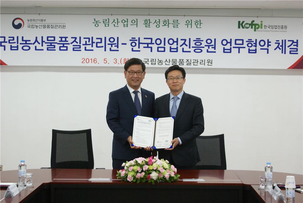 국립농산물품질관리원은 3일 한국임업진흥원과 국산 농림산물 유통질서 확립과 소비활성화를 위한 업무협약을 체결했다.<br />