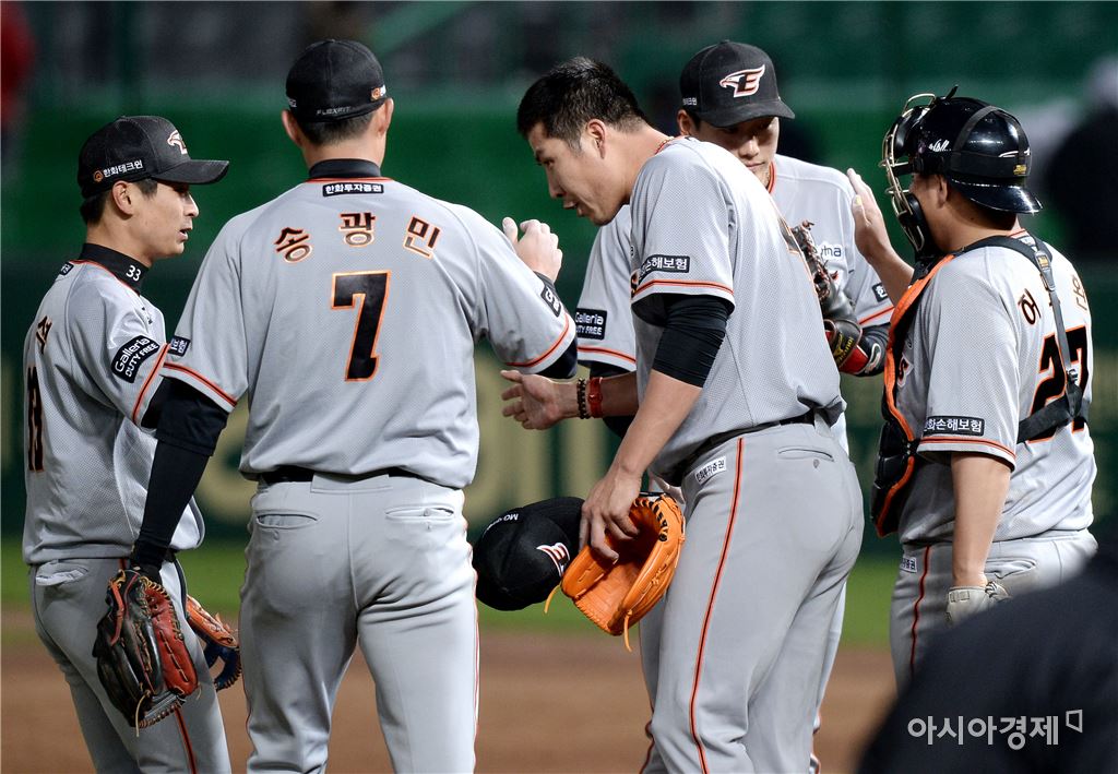 [문학=아시아경제 김현민 기자] 프로야구 한화 이글스와 SK 와이번스의 2016 KBO리그 경기가 3일 인천 문학구장에서 열렸다. 7-2로 승리를 거둔 한화 선수들이 자축하고 있다. 김현민 기자 kimhyun81@asiae.co.kr<ⓒ세계를 보는 창 경제를 보는 눈, 아시아경제(www.asiae.co.kr) 무단전재 배포금지>