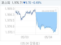 2016년 05월 04일 코스피 지수는 9.70p (0.49%) 하락한 1976.71로 마감했습니다.금일 (2시40분 기준) 코스피 주요 상승 종목은 한국주강,동양물산,미래아이앤지이며, 코스피 주요 하락 종목은 OCI,대호에이엘,형지엘리트입니다.아경봇 기자 r2@asiae.co.kr<ⓒ세계를 보는 창 경제를 보는 눈, 아시아경제(www.asiae.co.kr) 무단전재 배포금지>