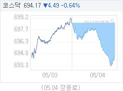 2016년 05월 04일 코스닥 지수는 4.49p (0.64%) 하락한 694.17로 마감했습니다.금일 (2시40분 기준) 코스닥 주요 상승 종목은 동양피엔에프,쌍용정보통신,아리온이며, 코스닥 주요 하락 종목은 신후,제이앤유글로벌,에스아이티글로벌입니다.아경봇 기자 r2@asiae.co.kr<ⓒ세계를 보는 창 경제를 보는 눈, 아시아경제(www.asiae.co.kr) 무단전재 배포금지>
