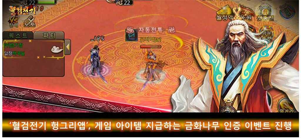 [아시아경제 온라인이슈팀] 모바일 정통 무협 MMORPG'혈검전기'의 유저 커뮤니티 ‘혈검전기 헝그리앱’에서는 유저들이 게임을 더욱 흥미진진하게 즐길 수 있도록 취보령(게임 아이템)을 제공하는 미션 이벤트를 진행하고 있다.이번 미션은 '금화나무를 흔들어 재껴쉐킷’으로 이벤트 기간 동안 게임을 진행하며 '금화나무'를 흔든 뒤 나온 결과를 캡처해 ‘혈검전기 헝그리앱’ 커뮤니티에 인증하면 추첨을 통해 취보령 10개와 헝그리앱 내에서 현금처럼 사용할 수 있는 밥알 포인트를 지급한다. 본이벤트는 5월8일까지 진행되며 자세한 내용은 '헝그리앱 미션' 또는 '혈검전기 헝그리앱' 커뮤니티 미션공지를 통해 확인할 수 있다.