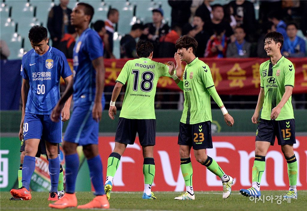 [전주=아시아경제 김현민 기자]2016 AFC 챔피언스리그(ACL) 전북 현대와 장쑤 쑤닝(중국)과의 조별리그 6차전이 4일 전주월드컵경기장에서 열렸다. 전북 선수들이 2-2 무승부로 16강 진출(조 1위)을 확정한 뒤 기뻐하고 있다. 김현민 기자 kimhyun81@asiae.co.kr<ⓒ세계를 보는 창 경제를 보는 눈, 아시아경제(www.asiae.co.kr) 무단전재 배포금지>