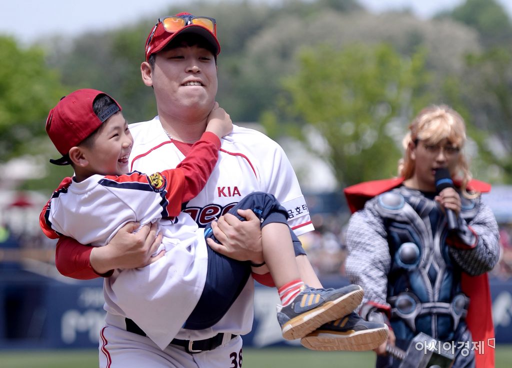 [광주=아시아경제 김현민 기자] 프로야구 롯데 자이언츠와 KIA 타이거즈의 2016 KBO리그 경기가 어린인날인 5일 광주구장에서 열렸다. 경기에 앞서 KIA 박준표가 어린이와 함께하는 그라운드 이벤트를 하고 있다. 김현민 기자 kimhyun81@asiae.co.kr<ⓒ세계를 보는 창 경제를 보는 눈, 아시아경제(www.asiae.co.kr) 무단전재 배포금지>