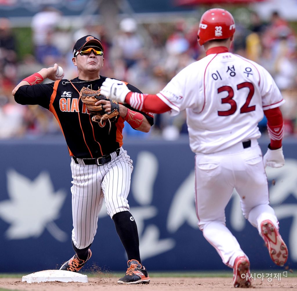 [광주=아시아경제 김현민 기자] 프로야구 롯데 자이언츠와 KIA 타이거즈의 2016 KBO리그 경기가 어린인날인 5일 광주구장에서 열렸다. 롯데 2루수 문규현이 2회말 1사 1루에서 KIA 오준혁의 투수 땅볼 때 1루주자 이성우를 포스아웃 시키고 1루로 송구하고 있다. 결과는 세이프.김현민 기자 kimhyun81@asiae.co.kr<ⓒ세계를 보는 창 경제를 보는 눈, 아시아경제(www.asiae.co.kr) 무단전재 배포금지>