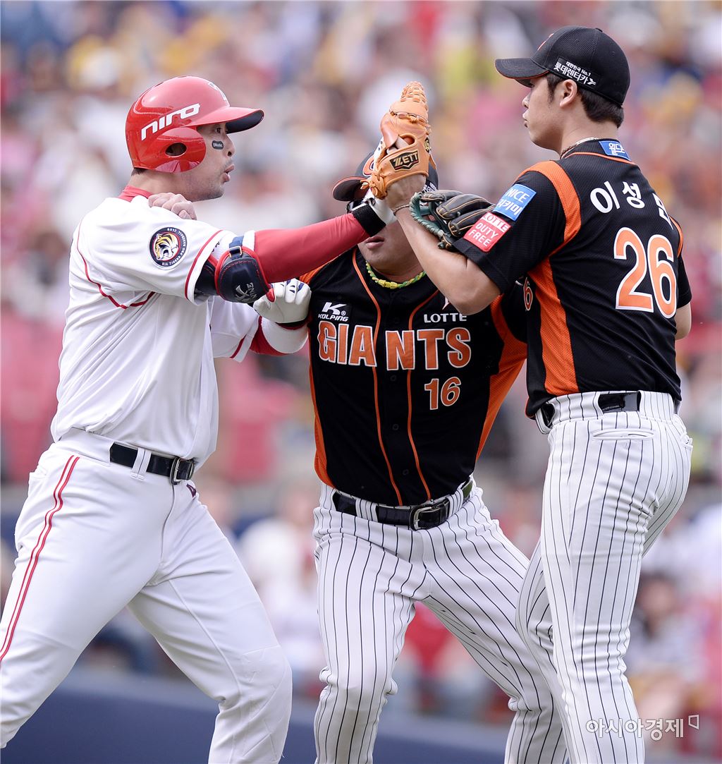 [광주=아시아경제 김현민 기자] 프로야구 롯데 자이언츠와 KIA 타이거즈의 2016 KBO리그 경기가 어린인날인 5일 광주구장에서 열렸다. 4회말 2사 주자 없는 상황에서 KIA 서동욱이 롯데 선발 이성민의 공에 맞아 벤치클리어링이 일어났다. 몸싸움하는 서동욱과 이성민.김현민 기자 kimhyun81@asiae.co.kr<ⓒ세계를 보는 창 경제를 보는 눈, 아시아경제(www.asiae.co.kr) 무단전재 배포금지>