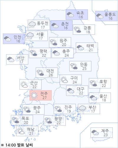 현재 기온이 가장 낮은 곳은 인천으로 영상 16도이며, 전주는 영상 27도로 가장 높은 기온을 기록하고 있고, 아침 최저기온은 영상 13도에서 영상 19도, 낮 최고기온은 영상 17도에서 영상 26도가 되겠습니다.미세먼지 농도: 오후 부산·울산·강원·충북·수도권 지방은 ‘보통’ 입니다.※ 미세먼지 자료는 인증되지 않은 실시간 자료이므로 오차가 발생할수 있음.아경봇 기자 r2@asiae.co.kr<ⓒ세계를 보는 창 경제를 보는 눈, 아시아경제(www.asiae.co.kr) 무단전재 배포금지>