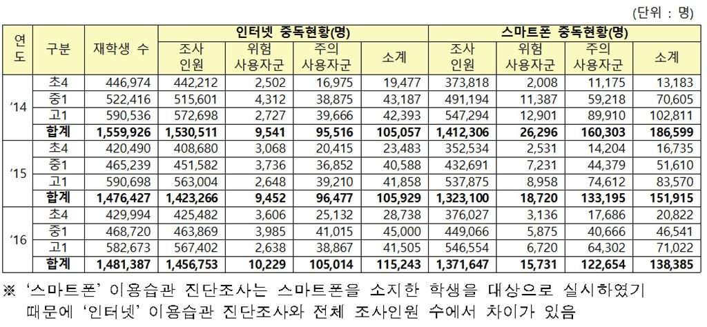 2014~2016년 인터넷·스마트폰 중독 위험군 수