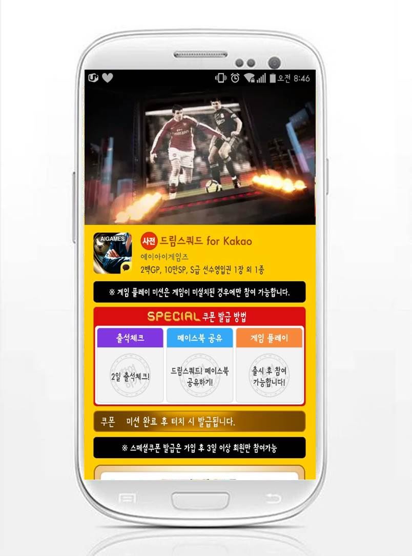 이번에 추가한 스페셜 사전예약 쿠폰은 신작 모바일 축구 매니지먼트 게임 ‘드림스쿼드 for Kakao' 쿠폰으로 등록하면 2백 GP, 10만 SP, S급 선수 영입권, S급 장비 획득권 등으로 구성된 풍성한 혜택을 지급한다.지난 2015년 1월 출시된 '드림스쿼드'의 카카오 버전인 ‘드림스쿼드 for Kakao’는 유저가 감독이 되어 전술을 짜고 선수를 배치하여 전략적인 경기를 펼치는 축구 매니지먼트 게임이다. 유명 축구 선수들의 실제 데이터를 게임에 자연스럽게 녹아 들게 한 점이 특징으로 축구 전용 스킬, 전지훈련, 유니폼 및 축구화 등의 장비 착용 시스템 등 리얼한 콘텐츠를 갖췄다.특히 3D 생중계 모드를 통해 내 클럽 선수들의 움직임을 확인하고 경기를 관람하며 그라운드 현장의 생생함을 느낄 수 있고 인공지능과의 경기인 '평가전'을 비롯해 다른 이용자와 시합하는 '리그전', 하루에 두 번 개최되는 '유로 리그'와 '토너먼트 리그'는 유저들의 경쟁심을 자극한다.‘모비’는 사전예약 기능뿐 아니라 일반 게임쿠폰 및 유저가 미션을 수행해야 발급되는 스페셜 게임쿠폰, 유저간의 쿠폰 나눔, KT 고주파 솔루션을 활용한 모바일 광고 등 다양한 기능을 한자리에 구현하였다. 스페셜 쿠폰 서비스 론칭을 기념해 게임 업체에서 2천만 원 상당의 사전예약 마케팅을 무료로 진행할 수 있도록 한시적으로 프로모션을 진행 중이다.온라인이슈팀 issue@asiae.co.kr<ⓒ세계를 보는 창 경제를 보는 눈, 아시아경제(www.asiae.co.kr) 무단전재 배포금지>