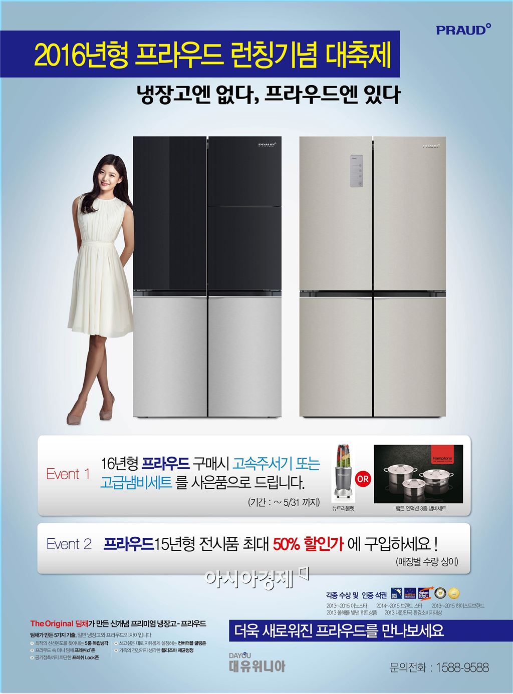 [아시아경제 원다라 기자] 2016년형 프라우드 냉장고를 구입하면 고속 주서기, 인덕션 전용 냄비세트를 증정하는 이벤트가 진행된다. 2015년형 프라우드 냉장고 전시품은 최대 50%까지 할인된 가격에 판매된다. 대유위니아는 31일까지 '2016년형 프라우드 런칭 기념 대축제'를 실시한다. 행사 기간 중 2016년형 프라우드 냉장고를 구매하는 고객에는 사은품으로 대유위니아의 프리미엄 고속 주서기 '뉴트리불렛' 또는 주방 식기 브랜드 '햄튼'의 인덕션 3종 냄비세트를 증정한다. 2015년형 프라우드 냉장고 전시품을 최대 50%까지 할인 판매하는 행사도 진행한다. 할인 대상 제품·수량은 매장별로 다르다. 행사는 전국 '위니아 딤채 프라자', 하이마트, 전자랜드, 백화점, 할인점 등에서 진행된다. 2016년형 프라우드 냉장고에는 대유위니아 김치냉장고 브랜드인 '딤채'에 적용된 프레시 디존' 기술이 적용돼 김치·채소 등을 신선하게 보관할 수 있도록 했다. '컨버터블 쿨링 존' 기능으로 하부 냉동 공간을 사용자 필요에 따라 냉장·생동·특냉·김치모드로 변경해 사용할 수 있다. 공간별로 식품 종류에 따른 맞춤형 온도 제어 및 보관할 수 있도록 전용 냉각기도 장착했다. 2016년형 프라우드 냉장고는 고급스러운 디자인의 '프리미엄' 라인과 메탈소재로 심플함을 극대화한 '스탠다드·에센스' 라인으로 구성됐으며 4가지 용량(920L, 918L, 900L, 892L)의 7개 모델로 출하가는 430만원에서 255만원이다.신중철 대유위니아 마케팅사업부장은 "프리미엄 냉장고의 뛰어난 기능에 감각적인 디자인까지 더한 2016년형 프라우드 출시를 기념해 이번 행사를 기획했다"며 "특별한 구매 혜택과 함께 새로워진 2016년형 프라우드를 경험해보시길 바란다"고 말했다.원다라 기자 supermoon@asiae.co.kr<ⓒ세계를 보는 창 경제를 보는 눈, 아시아경제(www.asiae.co.kr) 무단전재 배포금지>