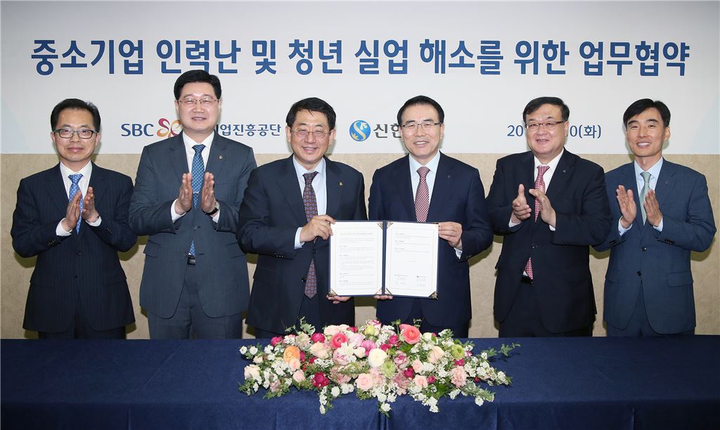 조용병 신한은행 은행장(오른쪽에서 세번째)과 임채운 중소기업진흥공단 이사장(오른쪽에서 네번째)이 10일 서울 광진구 건국대학교 새천년관에서 ;중소기업 인력난과 청년 실업 해소를 위한 업무협약' 체결 후 기념촬영을 하고 있다. (사진 : 신한은행)