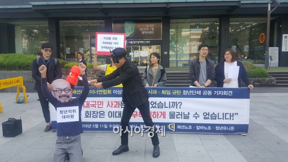 [아시아경제 김봉수 기자, 문제원 수습기자] "지난 1년간 패션업계의 열정페이 문제를 해결한다고 하더니 아무 것도 하지 않은 채 임기가 끝났다고 사퇴해버리면 답니까?".청년단체들이 유명 패션디자이너 이상봉씨를 1년 만에 재차 규탄하고 나섰다. 패션노조·알바노조·청년유니온 등 3개 단체는 11일 오전 10시 종로구 서울창조경제혁신센터 앞에서 기자회견을 열고 이 씨를 비판하면서 "한국패션디자인연합회장으로 있으면서 패션업계 청년 열정페이 문제를 방관했다"고 주장했다.이들은 "이 전 회장이 지난해 패션업계 청년착취가 논란이 된 이후 공개 사과문을 통해 ‘전문가들과 함께 문제점을 개선하고 현실적인 대안 마련에 노력하겠다’고 했지만 전혀 개선된 점이 없었다"고 주장했다.패션디자인연합회와 지난해부터 ‘패션디자인업계 노무환경 문제해결을 위한 3자 협의회’를 구성하고 1년 남짓 회의를 해왔지만, 아무런 성과가 없었던 상황에서 지난 10일 임기가 끝난 이 전 회장이 사퇴해버리고 말았다는 것이다. 현린 노동당 문화예술위원장은 기자회견에서 “패션업계 노동자들은 옷을 만들면서도 자신의 옷을 사지 못할 만큼 착취를 당해왔다"며 "패션업계가 패션쇼에서 보여줘야 할 것은 아름다운 옷뿐 아니라 아름다운 세상""이라고 주장했다. 김민수 청년유니온 위원장은 “이상봉 디자이너의 무책임한 행동에 대해 참담함을 금할 수가 없다”며 “지난 1년 동안의 노력이 아무것도 아닌 게 될 수 없다. 앞으로 끊임없이 관심을 가져 일선에서 벌어지는 착취가 고쳐지도록 노력하겠다”고 말했다.한편 이 단체들은 기자회견 후 이 전 회장의 가면을 쓴 참가자 한 명이 ‘착취 대마왕’이라는 팻말을 목에 걸고 뿅망치를 맞는 퍼포먼스가 진행됐다. 김봉수 기자 bskim@asiae.co.kr문제원 수습기자 nest2639@asiae.co.kr<ⓒ세계를 보는 창 경제를 보는 눈, 아시아경제(www.asiae.co.kr) 무단전재 배포금지>