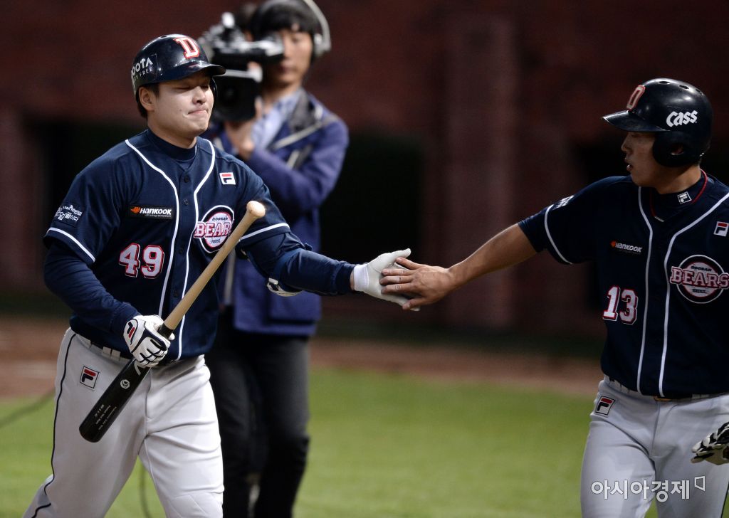 [문학=아시아경제 김현민 기자] 프로야구 두산 베어스와 SK 와이번스의 2016 KBO리그 경기가 11일 인천 문학구장에서 열렸다. 5회초 2사 1루에서 두산 민병헌이 SK 선발 세든을 상대로 우월 투런 홈런을 치고 선행주자 허경민과 하이파이브하고 있다. 김현민 기자 kimhyun81@asiae.co.kr<ⓒ세계를 보는 창 경제를 보는 눈, 아시아경제(www.asiae.co.kr) 무단전재 배포금지>