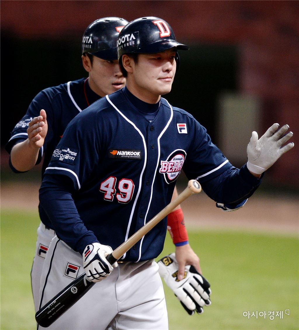 [문학=아시아경제 김현민 기자] 프로야구 두산 베어스와 SK 와이번스의 2016 KBO리그 경기가 11일 인천 문학구장에서 열렸다. 5회초 2사 1루에서 두산 민병헌이 SK 선발 세든을 상대로 우월 투런 홈런을 치고 동료들과 하이파이브하고 있다. 김현민 기자 kimhyun81@asiae.co.kr<ⓒ세계를 보는 창 경제를 보는 눈, 아시아경제(www.asiae.co.kr) 무단전재 배포금지>
