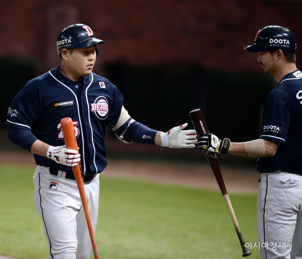 [문학=아시아경제 김현민 기자] 프로야구 두산 베어스와 SK 와이번스의 2016 KBO리그 경기가 11일 인천 문학구장에서 열렸다. 6회초 두산 선두타자 양의지가 SK 선발 세든을 상대로 좌월 연타석 홈런을 치고 대기타석의 오재원과 하이파이브하고 있다. 김현민 기자 kimhyun81@asiae.co.kr<ⓒ세계를 보는 창 경제를 보는 눈, 아시아경제(www.asiae.co.kr) 무단전재 배포금지>