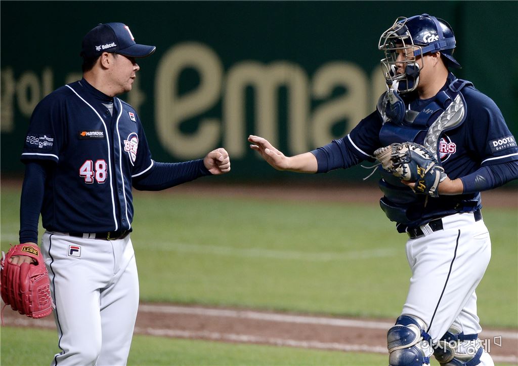 [문학=아시아경제 김현민 기자] 프로야구 두산 베어스와 SK 와이번스의 2016 KBO리그 경기가 11일 인천 문학구장에서 열렸다. 두산 마무리 이현승이 팀의 7-3 승리를 확정한 뒤 양의지 포수와 하이파이브하고 있다. 김현민 기자 kimhyun81@asiae.co.kr<ⓒ세계를 보는 창 경제를 보는 눈, 아시아경제(www.asiae.co.kr) 무단전재 배포금지>