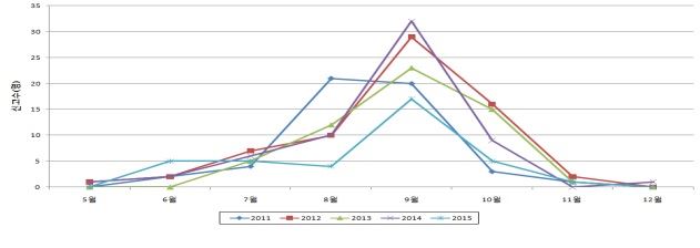 ▲비브리오패혈증 연도별 월별 환자 발생 현황(2011∼2015).[자료제공=질병관리본부]<br />