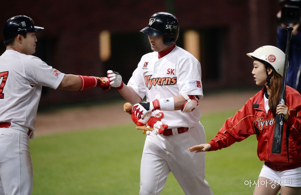 [문학=아시아경제 김현민 기자]프로야구 두산 베어스와 SK 와이번스의 2016 KBO리그 경기가 12일 인천 문학구장에서 열렸다. 7회말 SK 선두타자 최정이 두산 윤명준을 상대로 좌월 추가 솔로 홈런을 치고 정의윤과 하이파이브하고 있다. 김현민 기자 kimhyun81@asiae.co.kr<ⓒ세계를 보는 창 경제를 보는 눈, 아시아경제(www.asiae.co.kr) 무단전재 배포금지>