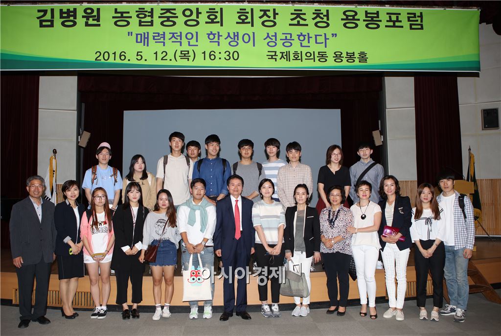 "전남대, 김병원 농협중앙회장 초청 용봉포럼 성료 "[아시아경제 노해섭 기자]“인생을 성공으로 이끌기 위해서는 자신만의 ‘매력’이 있어야 하며, 끊임없이 도전하고 새로움을 추구해야 합니다.”김병원(62) 농협중앙회장이 대학생들에게 들려주는 인생성공 비결이다. 김 회장은 12일 오후 전남대학교 대학본부 국제회의동 용봉홀에서 열린 ‘용봉포럼’에 연사로 나와 이같이 말했다.김 회장은 이날 ‘매력적인 학생이 성공한다’는 주제의 강연을 통해 “매력은 사람의 마음을 사로잡아 도깨비처럼 혼을 빼는 것이며, 성공을 위해서는 매력을 가꾸는 노력이 필요하다”고 말했다. 이어 “성공적인 삶을 위해서는 ‘버킷리스트’를 작성해 하나 하나 실천하는 노력이 필요하다”면서 “또한, 늘 새로운 것에 도전하고 발상의 전환을 시도해야 한다”고 강조했다. 김 회장은 특히, “자신이 꿈꾸는 세상을 되뇌이며 자꾸 말하다 보면 결국은 현실이 되고 만다는 ‘자성예언’이라는 말이 있듯, 꿈을 현실로 만들려는 노력, 그것이 현실이 됐을 때의 모습을 ‘시각화’해보는 습관이 필요하다”고 덧붙였다.전남 나주 출신으로 전남대학교에서 경영학 ·농업개발학 석사, 농업경제학 박사 학위를 취득한 김병원 회장은 남평농협조합장 3선, 농협중앙회 이사 2선, NH무역 대표이사, 농협양곡 대표이사 등을 거쳐 지난 3월 제23대 농협중앙회장에 취임했다.이날 용봉포럼에는 전남대학교 재학생과 농민 등 400여 명이 참석해 뜨거운 열기를 보여줬다.한편, 전남대학교는 구성원 및 지역민을 위해 다양한 주제를 갖고 각계의 저명인사를 초청, 용봉포럼을 개최하고 있다. 노해섭 기자 nogary@<ⓒ세계를 보는 창 경제를 보는 눈, 아시아경제(www.asiae.co.kr) 무단전재 배포금지>