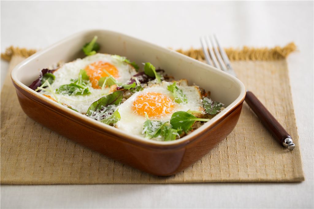 4. 달걀은 프라이하여 얹고 샐러드 채소를 올린 후 치즈를 뿌린다. <br />