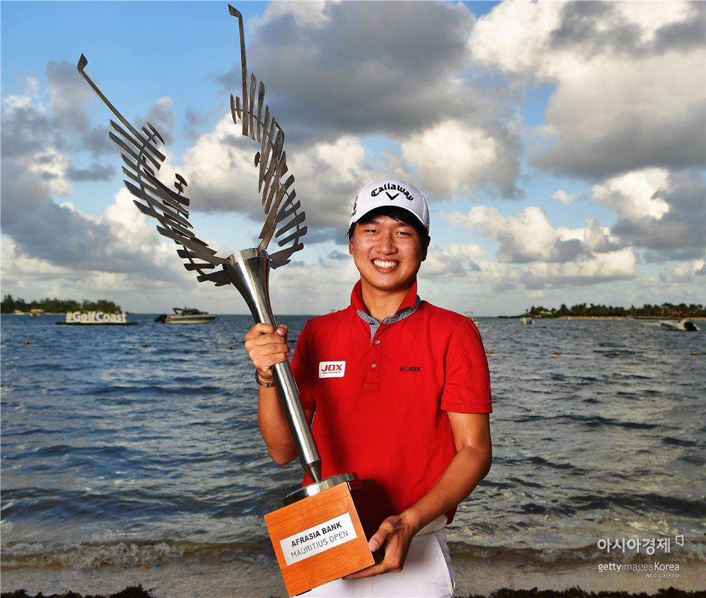 왕정훈이 모리셔스오픈 우승 직후 트로피를 들고 환호하고 있다. 사진=Getty images/멀티비츠