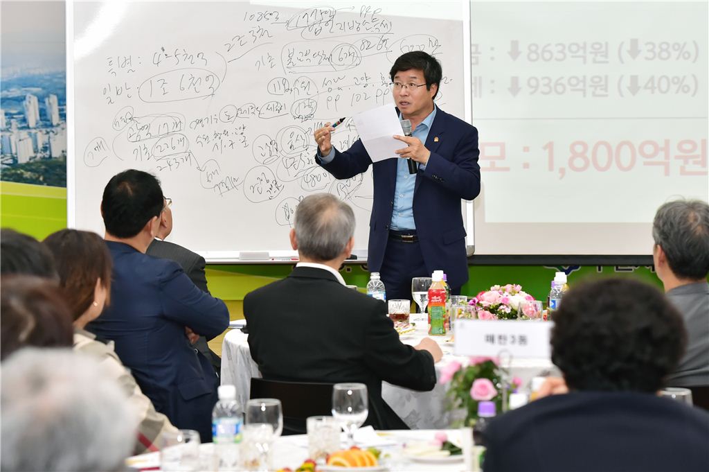 염태영 수원시장이 주민들과의 소통의 시간을 갖고 정부의 지방재정개편안 부당성과 함께 시정 주요 현안에 대해 설명하고 있다.
