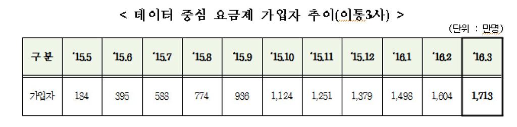 [아시아경제 강희종 기자]오는 20일로 이동통신 3사가 데이터중심 요금제를 출시한지 1년이 된다. 데이터중심 요금제 출시 이후 데이터 사용량이 크게 증가한 반면 통신 요금 부담은 줄어든 것으로 나타났다.17일 한국통신사업자연합회(KTOA)에 따르면 2016년 3월 기준 국내 데이터중심 요금제 가입자는 1730만명에 이른다.2015년 5월 8일 KT가 처음 데이터중심요금제를 선보인 데 이어 15일 LG유플러스, 20일 SK텔레콤이 잇따라 데이터중심요금제를 출시한 지 1년만에 전체 이동전화 가입자(5952만명)의 28.7%가 데이터중심요금제를 쓰고 있는 것이다. 이동전화 가입자 세명중 한명 꼴이다.데이터중심요금제는 출시 당시 해외에 비해 저렴하다는 호평속에 소비자들로부터 많은 지지를 받았으며 매월 100만명 이상 증가하는 추세를 보이고 있다.