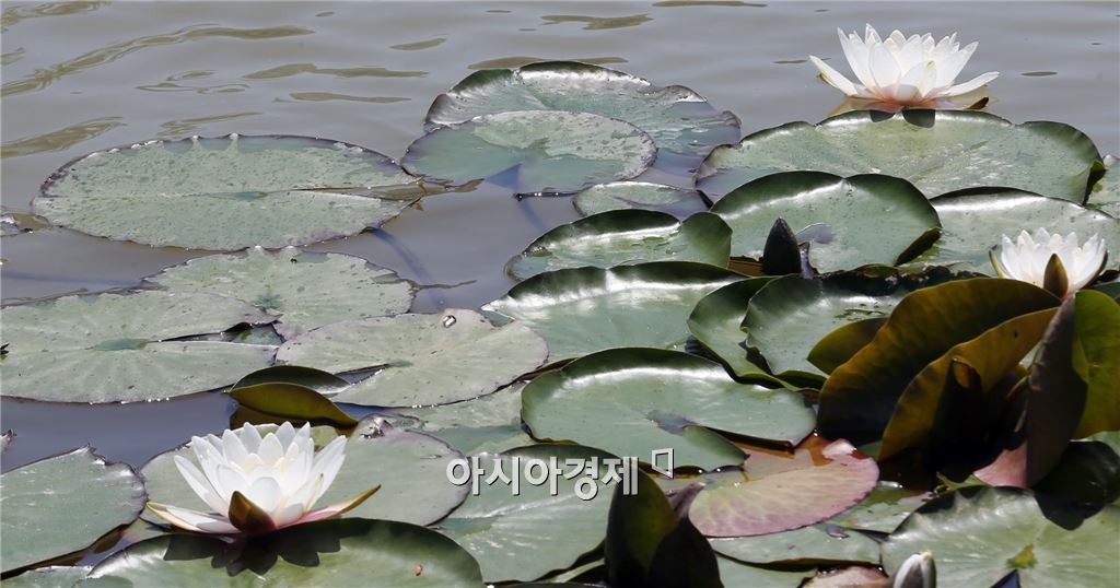 초여름 날씨를 보인 가운데 17일 함평군 함평엑스포공원 연못에서 꽃망울을 터트린 수련이 수려한 자태를 뽐내고 있다. 사진제공=함평군