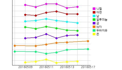 국제 원자재 시장에서 WTI(서부텍사스산원유)의 현물시세가 전일 대비 1.02 달러 오른 배럴당 47.72 달러를 기록했고, 두바이유 현물시세는 전일 대비 0.7 달러 오른 배럴당 45.35 달러를 기록했다.금 현물시세는 전일 대비 1.46 달러 오른 온스당 1274.05 달러를 기록했고, 은 현물시세도 전일 대비 0.04 달러 오른 온스당 17.15 달러를 기록했다.주요광물시세는 주석이 전일 대비 톤당 95.57 달러 올라 16900 달러를 기록했고 니켈이 상승세를 보이는 반면, 납이 전일 대비 톤당 22.55 달러 떨어져 1701.25 달러를 기록했고 알루미늄, 아연이 하향세를 보였다.환율