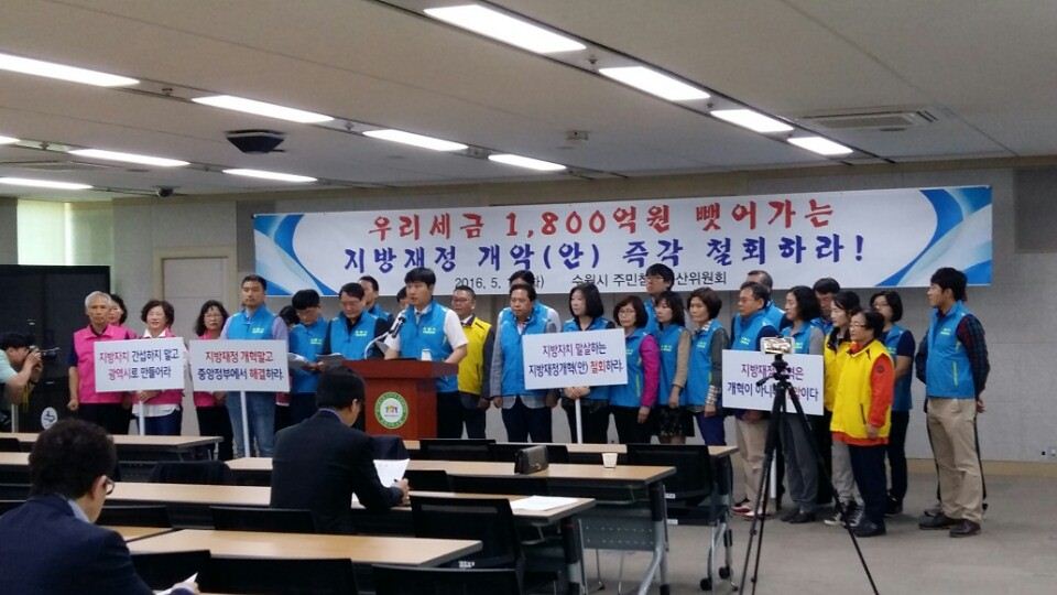 수원시 주민참여예산위원회가 정부의 지방재정개편안 철회 촉구 기자회견을 하고 있다.