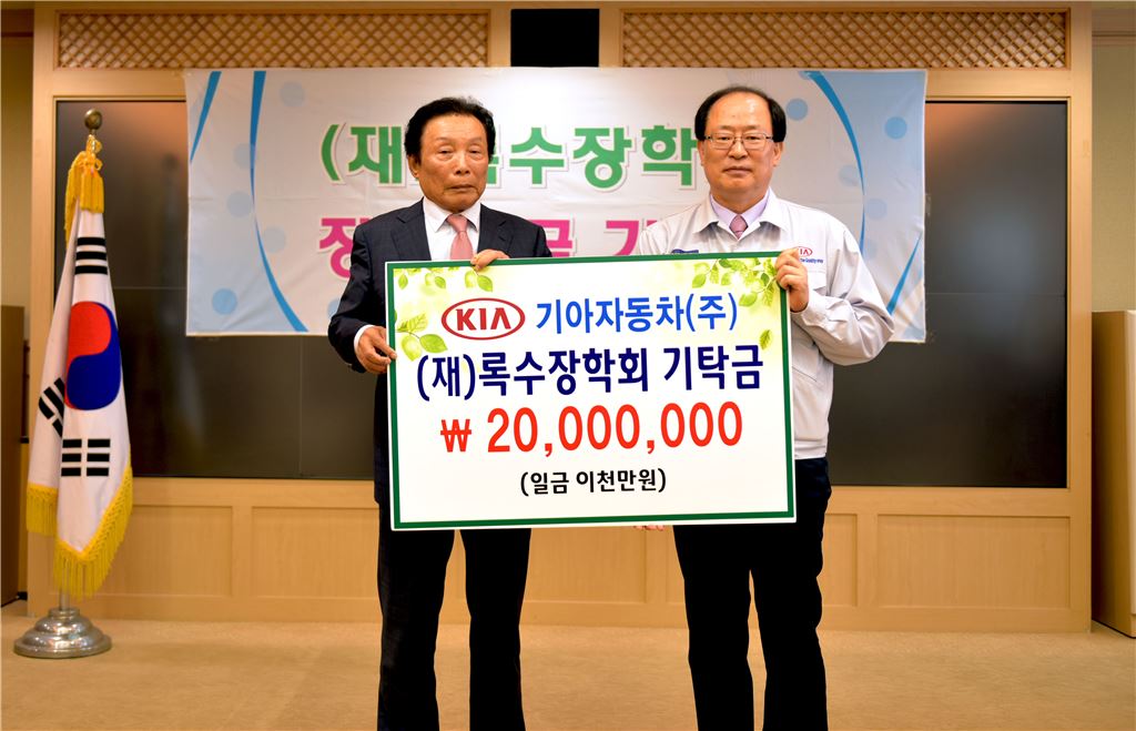 기아자동차 광주공장(공장장 김종웅)이 소방공무원의 자녀에 대한 장학금 지원을 위해 ‘(재)록수장학회 후원금 전달식’을 가졌다. 사진은 김종웅 기아차 광주공장장(사진 오른쪽)이 (재)록수장학회 염홍섭 이사장에게 후원금 2000만원을 전달하고 있는 모습.