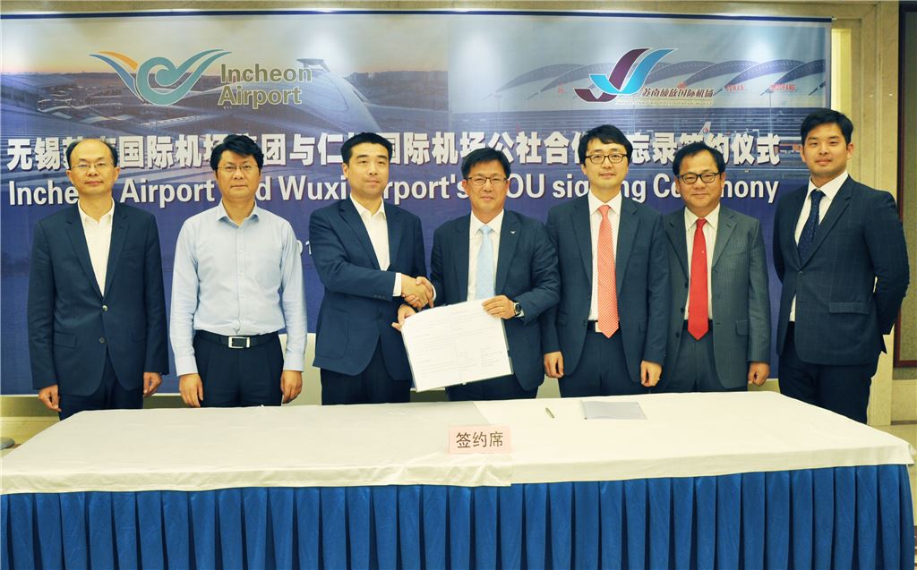 17일 오후 중국 우시 후빈 호텔에서 개최된 인천공항공사와 우시쑤난국제공항그룹의 항공화물 증대협력 MOU 체결식 후 임병기 인천공항공사 허브화추진실장(왼쪽에서 네번째), 주용지엔 우시쑤난국제공항그룹 부사장(왼쪽에서 세번째) 등 참석자들이 기념 촬영을 하고 있다.<br />