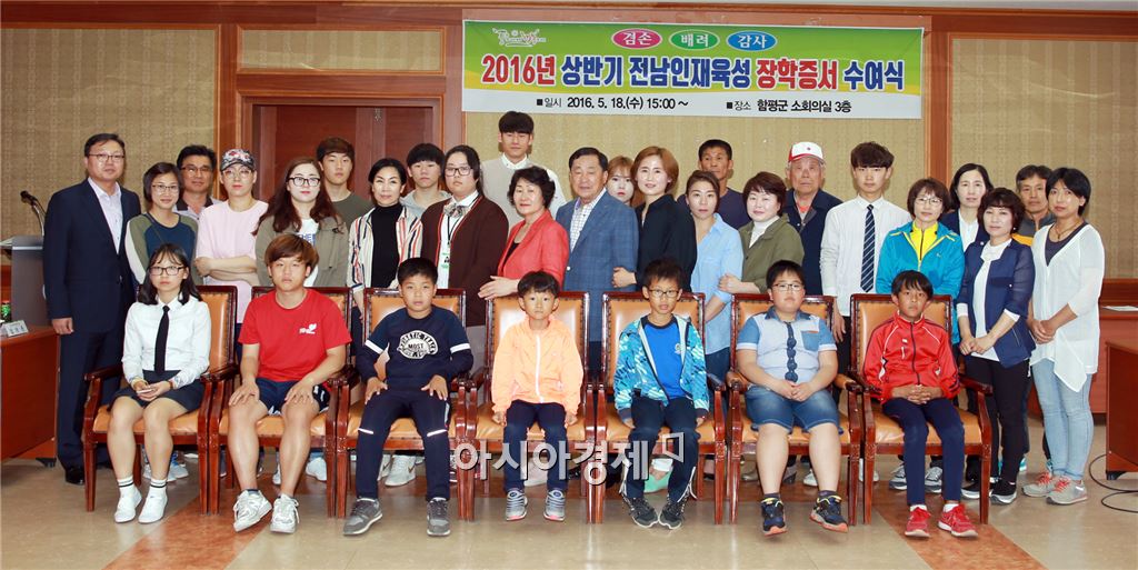 안병호 함평군수가 18일 군청 소회의실에서 올해 상반기 전남인재육성장학생으로 선발된 관내 학생 34명(초등생 9명, 중학생 3명, 고등학생 15명, 대학생 7명)에게 장학금 2063만원을 전달하고 있다.