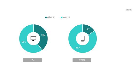 [아시아경제 강희종 기자]온라인 동영상 시청은 다운로드보다는 스트리밍을 이용하는 경향이 뚜렷하게 나타났다.디지털 마케팅 컨설팅 업체인 DMC미디어가 지난 3월 전국 인터넷 이용자 800명을 대상으로 조사한 결과 최근 6개월간 PC를 통해 온라인 동영상을 시청한 경험이 있다고 응답한 비중은 92.9%로, 모바일 동영상 시청 경험(90.1%), 케이블TV 또는 IPTV를 통해 주문형비디오(VOD)를 시청한 경험 76.0%보다 높게 나타났다.온라인 시청은 다운로드보다는 스트리밍으로 이용하는 이들이 대부분을 차지했다. PC에서는 스트리밍 비중이 60.6%로 다운로드 39.4%에 비해 높았으며, 모바일에서는 스트리밍이 84.3%로 다운로드 15.7%에 비해 압도적으로 높았다.온라인 동영상 유무료 시청 경험 설문조사(출처:DMC미디어)