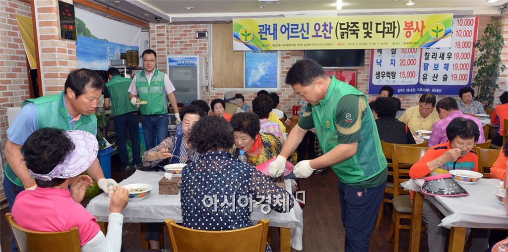 광주 남구 월산5동 새마을협의회(회장 김경묵)는 22일 관내 음식점에서 어르신 300여 명을 초청, 닭죽 나눔 배식 봉사활동을 펼쳤다.