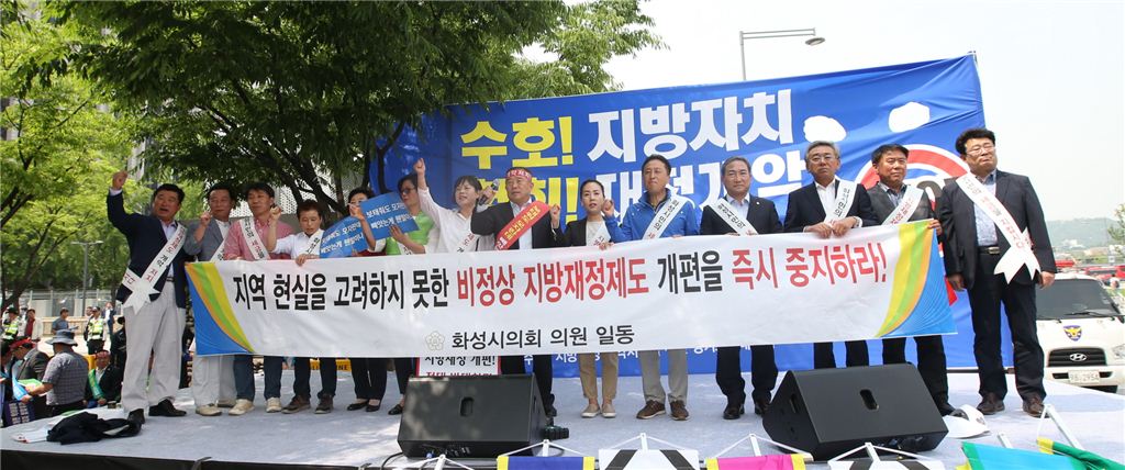 화성시의회 의원들이 지방재정개편안 반대를 촉구하는 집회를 열고 있다.