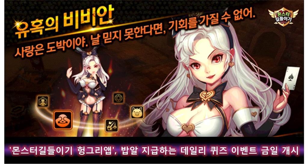 [아시아경제 온라인이슈팀] 넷마블 게임즈에서 서비스하는 인기 모바일 게임 '몬스터 길들이기 for Kakao(이하 몬스터길들이기)'가 지난 19일 신규 캐릭터 '노련한 블라디카'와 신규 초월 캐릭터 '유혹의 비비안', '영생의 블라디카'를 추가해 유저들의 눈길을 끄는 가운데유저 커뮤니티 '몬스터 길들이기 헝그리앱'에서는 유저들이 신규 캐릭터를 이용하는 데 도움을 주고자 금전적 혜택을 지급하는 데일리 퀴즈미션 이벤트를 금일(23일) 시작했다. 이번 미션은 '5/23~24 나와라! 숨은 캐릭터 찾기!'로 미션 기간 동안 제시된 퀴즈의 답안을 '몬스터 길들이기 헝그리앱' 커뮤니티에 비밀글로 작성하면 정답을 맞춘 사람 중 추첨을 통해 헝그리앱내에서현금처럼사용할수있는밥알포인트를지급한다. 본이벤트는5월 24일까지 진행되며 자세한 내용은 '헝그리앱 미션' 또는 '몬스터 길들이기 헝그리앱' 커뮤니티 미션 공지를 통해 확인할 수 있다.
