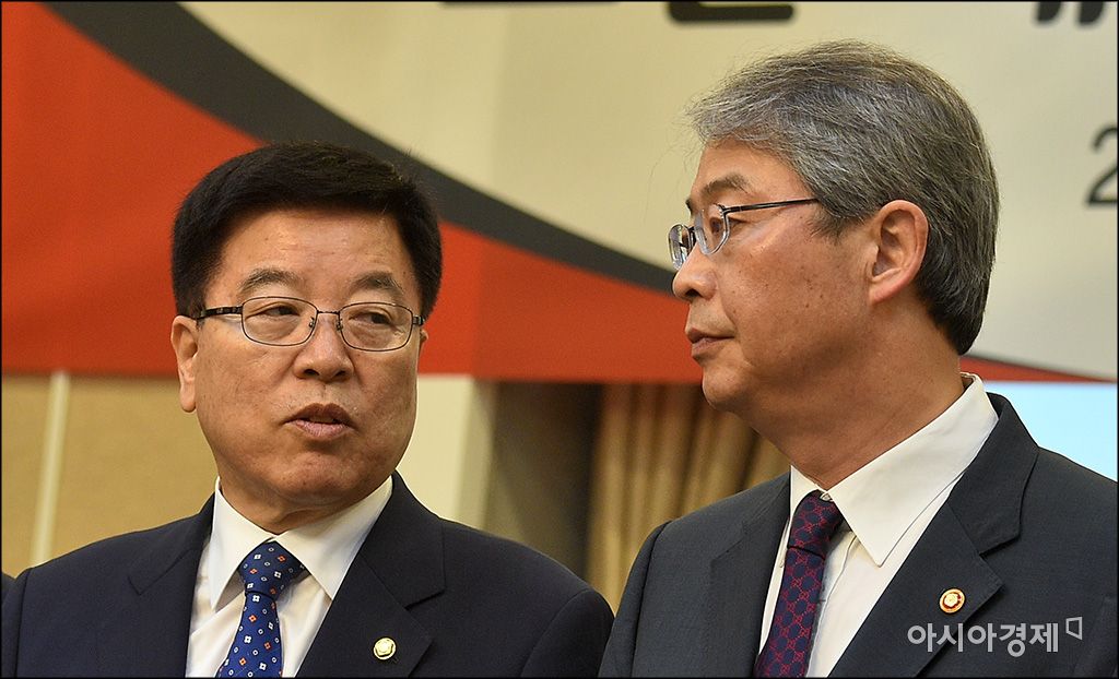 김광림 새누리당 정책위의장(왼쪽)과 임종룡 금융위원회 위원장이 24일 서울 여의도 국회에서 열린 조선·해운업 구조조정관련 당정협의에 참석, 회의 시작 전 이야기를 나누고 있다./윤동주 기자 doso7@