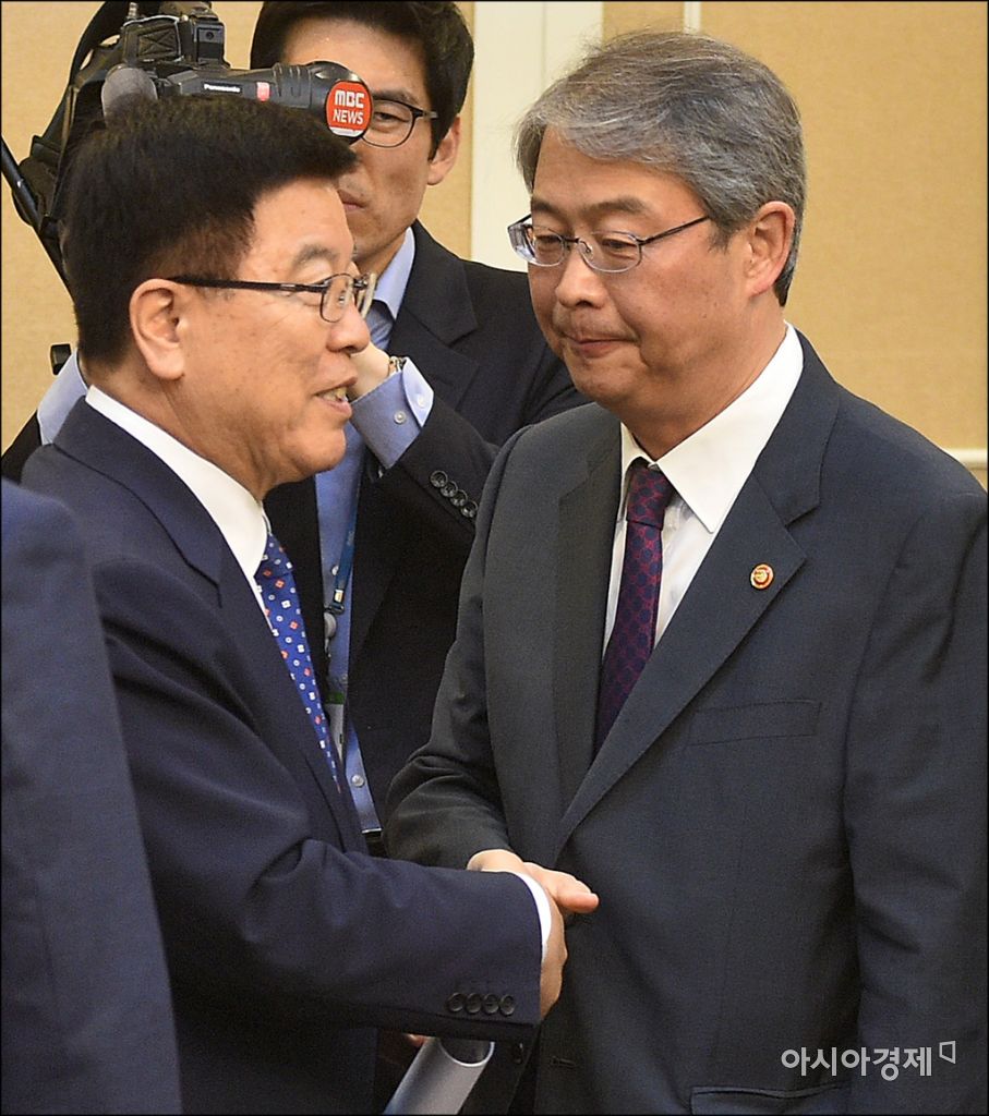 [아시아경제 윤동주 기자] 김광림 새누리당 정책위의장과 임종룡 금융위원회 위원장이 24일 서울 여의도 국회에서 열린 조선·해운업 구조조정관련 당정협의에 참석, 인사를 나누고 있다.윤동주 기자 doso7@asiae.co.kr<ⓒ세계를 보는 창 경제를 보는 눈, 아시아경제(www.asiae.co.kr) 무단전재 배포금지>