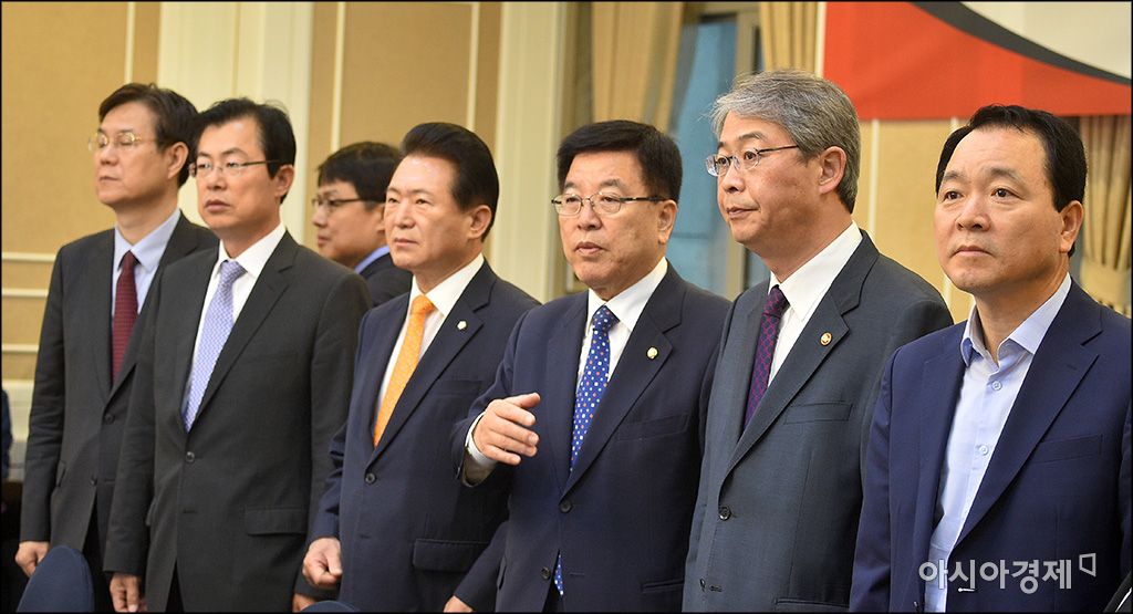 [아시아경제 윤동주 기자] 김광림 새누리당 정책위의장과 임종룡 금융위원회 위원장 등 참석자들이 24일 서울 여의도 국회에서 열린 조선·해운업 구조조정관련 당정협의에 참석, 회의 시작 전 기념 촬영을 하고 있다.윤동주 기자 doso7@asiae.co.kr<ⓒ세계를 보는 창 경제를 보는 눈, 아시아경제(www.asiae.co.kr) 무단전재 배포금지>