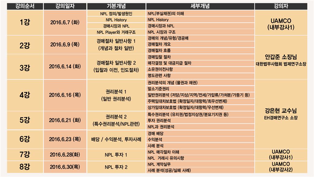비슷비슷한 강의는 많지만 중요한 건 강사의 경쟁력이다. 국내 최고권위의 법원경매 강사진과 글로벌 금융위기 직후 국내 금융기관들이 출자해 만든 국내 최대 부실채권 관리회사인 유암코(UAMCO)의 사내강사진이 함께 NPL 강의를 직강한다.법원의 경매절차와 권리분석, 명도, 집행 실무의 권위자 안갑준 대한법무사협회 법제연구소장은 서울중앙지방법원 집행관, 대법원 재판사무국장, 전국법원 집행관연합회장 등 화려한 실무 경력을 자랑한다. 지금은 한양대와 건국대 부동산대학원에서 겸임교수로 활동하고 있다.강은현 EH경매연구소장은 한국부동산자산관리사 전문위원으로 활동하며 건국대와 아주대, 동국대 부동산과정 지도교수로 일하고 있다. 부동산 경매 필독서인 경매야놀자와 경매야놀자2 특수권리분석의 저자이기도 하다. 자세한 내용은 아시아경제TV 홈페이지를 참고하면 된다.<ⓒ아시아 대표 석간 '아시아경제' (www.newsva.co.kr) 무단전재 배포금지>