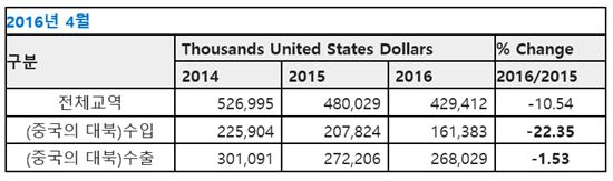 중국의 4월 대북 수출입 통계[자료:코트라 제공]