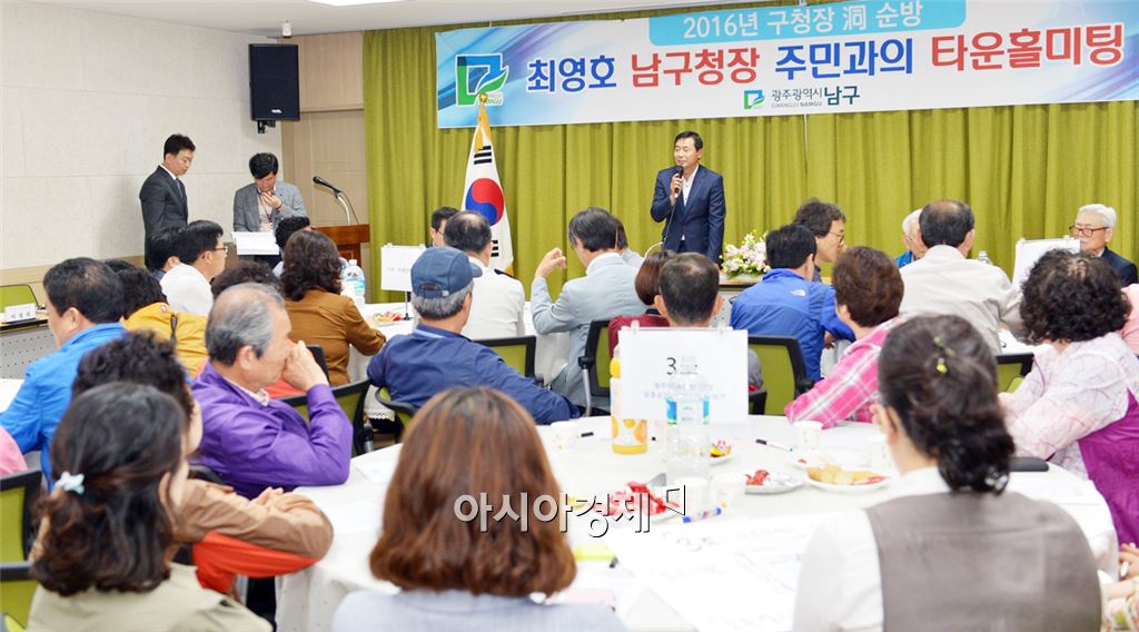 광주 남구(구청장 최영호) 24일 봉선1동 주민센터에서 구정 운영방향 설명 및 주민과의 소통 강화를 위한 ‘주민과의 타운홀미팅’을 실시했다.구청장 동 순방 ‘주민과의 타운홀 미팅’은 오는 6월 9일까지 16개 동별로 진행될 예정이다. 사진제공=광주시 남구<br />