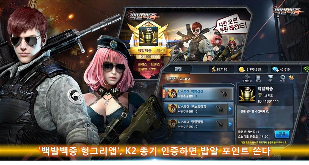 [아시아경제 온라인이슈팀] 넷마블게임즈에서 서비스하는 모바일 슈팅게임 ‘백발백중 for Kakao(이하 백발백중)’가 지난 21일부터 3개월간 진행되는 e스포츠 리그 '백발백중 챌린지'를 시작해 화제를 모으는 가운데 유저 커뮤니티 ‘백발백중 헝그리앱’에서는 유저들이 게임을 즐기는 데 도움을 주고자 다양한물품을살수있는금전적 혜택을 제공하는 인증 미션 이벤트를진행하고 있다.이번미션은 '대한민국 국군장병의 총 K2를 찾아라!'로이벤트기간동안 친구나 자신이 구매한 총기 'K2'의 인증화면을 캡처해'백발백중헝그리앱' 커뮤니티에 게재하면 추첨을 통해 헝그리앱 내에서 현금처럼 사용할 수 있는 밥알 포인트를 지급한다. 본이벤트는5월 26일까지진행되며자세한내용은'헝그리앱 미션' 또는 '백발백중헝그리앱' 커뮤니티 미션공지를 통해 확인할 수 있다.헝그리앱에서 진행하는 다양한 이벤트와 커뮤니티 활동을 통해 획득한 밥알포인트는 ‘헝그리앱헝앱샵’에서 ‘구글플레이기프트카드’, ‘게임 캐시’, ‘문화상품권’을 비롯해 각종 게임아 이템, 게이밍 키보드 및 마우스, 영화예매권, 외식프랜차이즈이용권등, 게임 및 실생활에 필요한 유용한 상품들을 구매할 수 있다.온라인이슈팀 issue@asiae.co.kr<ⓒ세계를 보는 창 경제를 보는 눈, 아시아경제(www.asiae.co.kr) 무단전재 배포금지>