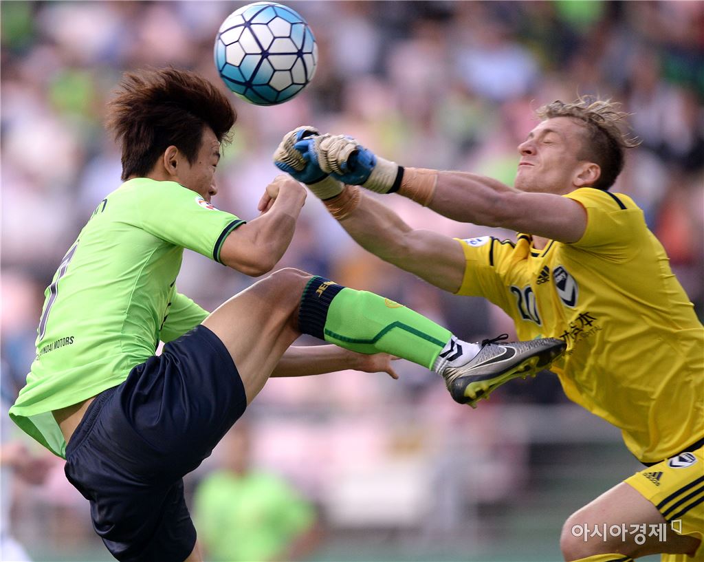 [전주=아시아경제 김현민 기자] 전북 현대와 멜버른 빅토리(호주)과의 2016 AFC 챔피언스리그(ACL) 16강 2차전이 24일 전주월드컵경기장에서 열렸다. 전북 한교원이 상대 골키퍼와 충돌하고 있다. 김현민 기자 kimhyun81@asiae.co.kr<ⓒ세계를 보는 창 경제를 보는 눈, 아시아경제(www.asiae.co.kr) 무단전재 배포금지>