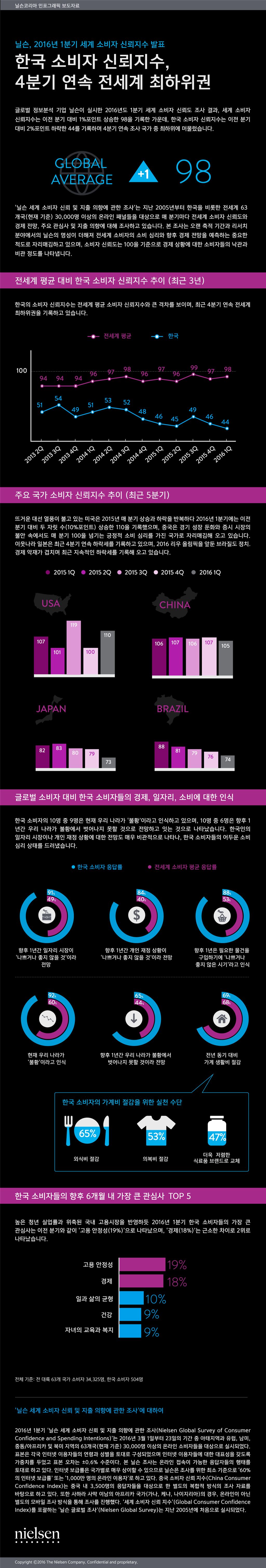 닐슨, 2016년 1분기 세계 소비자 신뢰지수 발표한국 소비자 신뢰지수 4분기 연속 전세계 최하위권[아시아경제 조호윤 기자]한국 소비자 신뢰지수가 4분기 연속 전세계 최하위권을 기록했다. 또 한국 소비자 10명 중 9명은 현재 우리나라가 불황이라고 인식했으며 향후 불황을 벗어나지 못할 것이란 전망도 60%에 달했다. 25일 글로벌 정보분석기업 닐슨이 실시한 올해 1ㆍ4분기 세계소비자신뢰도 조사 결과, 세계 소비자 신뢰지수는 전분기 대비 1%포인트 상승한 98을 기록했다. 이 중 한국소비자 신뢰지수는 전분기 대비 2%포인트 떨어진 44를 기록, 4분기 연속 조사국가 중 최하위에 머물렀다.한국의 소비자신뢰지수는 전 세계 평균 소비자신뢰지수와 큰 격차를 보이며, 최근 4분기 연속 전 세계 최하위권을 기록하고 있다. 실제 한국소비자의 10명중 9명은 현재우리나라가 '불황'이라고 인식했다. 또 10명중 6명은 향후 1년간 우리나라가 불황에서 벗어나지 못할 것으로 전망했다. 한국인의 일자리시장이나 개인 재정상황에 대한 전망도 매우 비관적으로 나타나, 한국소비자들의 어두운 소비심리상태를 드러냈다뜨거운 대선열풍이 불고 있는 미국은 2015년 매분기 상승과 하락을 반복하다 올 1분기에는 전분기 대비 두자릿수(10%포인트)상승한 110을 기록했다. 중국은 경기성장둔화와 증시시장의 불안 속에서도 매분기 100을 넘기는 긍정적 소비심리를 가진 국가로 자리매김 해오고 있다.일본은 최근 4분기연속 하락세를 기록 중이며, 올해 리우올림픽을 앞둔 브라질도 정치 경제악재가 겹치며 최근 지속적인 하락세를 보였다. 한편 닐슨 세계소비자 신뢰 및 지출의향에 관한 조사'는 2005년부터 한국을 비롯한 전 세계 63개국(현재기준) 3만명 이상의 온라인패널들을 대상으로 매분기마다 전 세계 소비자신뢰도와 경제전망, 주요관심사 및 지출의향에 대해 조사하고 있다. 조호윤 기자 hodoo@asiae.co.kr<ⓒ세계를 보는 창 경제를 보는 눈, 아시아경제(www.asiae.co.kr) 무단전재 배포금지>