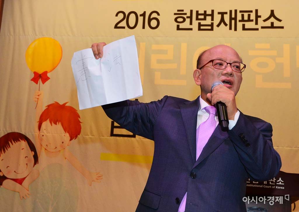 [아시아경제 백소아 기자] 25일 서울 종로구 헌법재판소에서 열린 어린이 헌법교실 입교식에서 박한철 헌법재판소장이 인사말을 하던 중 한 학생이 한자로 쓴 '헌법'을 들고 이야기를 하고 있다.백소아 기자 sharp2046@asiae.co.kr<ⓒ세계를 보는 창 경제를 보는 눈, 아시아경제(www.asiae.co.kr) 무단전재 배포금지>