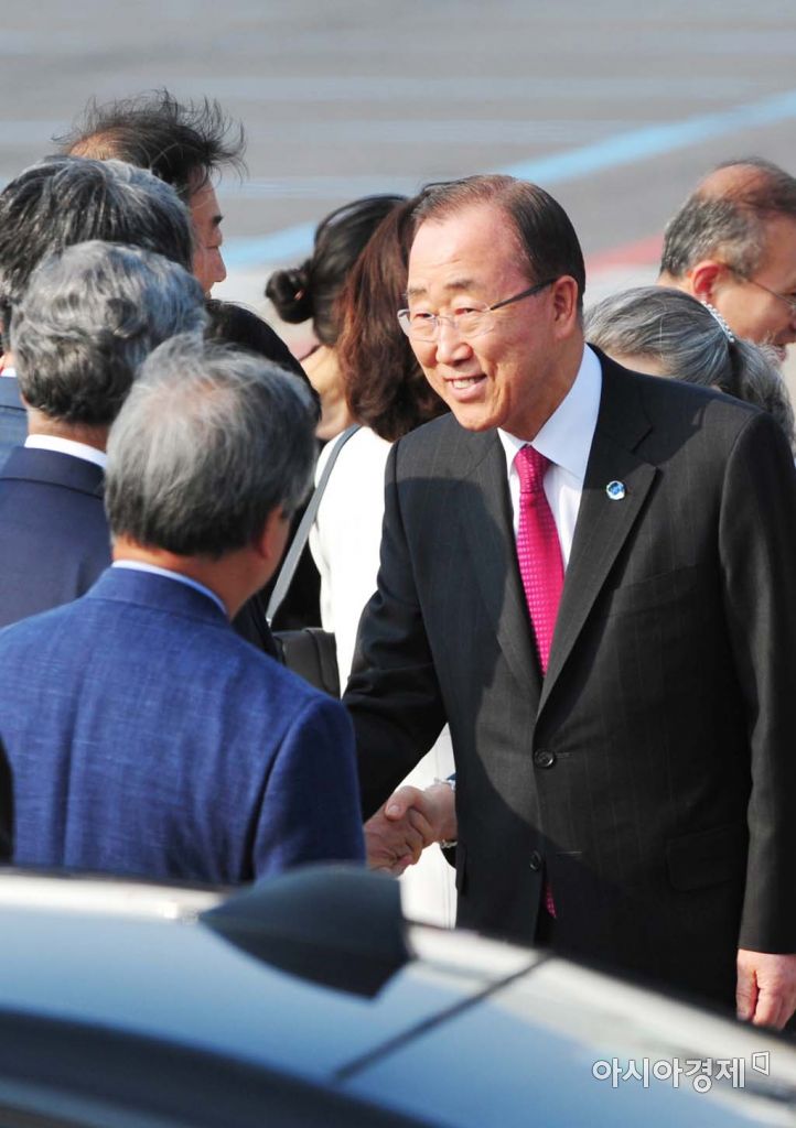 [아시아경제 ] 반기문 유엔 사무총장이 25일 오후 제주공항을 통해 입국하고 있다. 지난해 5월 이후 약 1년 만에 방한한 반 총장은 이날 제주포럼 환영 만찬에 참석할 예정이다./사진공동취재단 <ⓒ세계를 보는 창 경제를 보는 눈, 아시아경제(www.asiae.co.kr) 무단전재 배포금지>