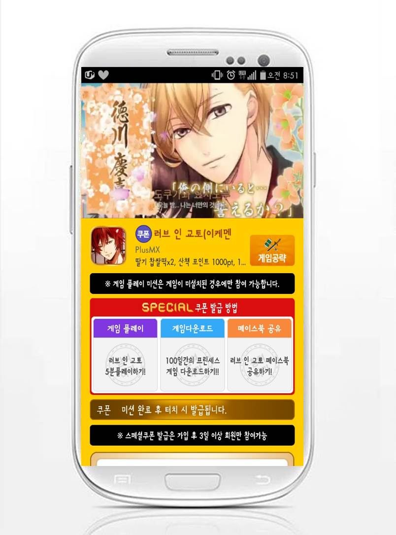 [아시아경제 온라인이슈팀] 350만 다운로드의사전예약 1위 어플리케이션 ‘모비’가 유저들이 게임을 더욱 풍성하게 즐길 수 있도록 타 어플에서는 받을 수 없는 파격적 혜택을 무료로 제공하는 스페셜 쿠폰을 지급하고 있다.이번에 지급하는스페셜쿠폰은 모바일판타지 시뮬레이션 게임‘러브인교토(이케멘 막말)’ 쿠폰으로 등록하면 딸기 찹쌀떡 2개와 1천 산책 포인트, 1천 냥을지급한다.2015년 12월 출시한'러브인교토'는 시공간을 초월한 스토리와 매력 넘치는 주인공들이 등장하는 여성향 시뮬레이션 게임이다. 스토리는 프롤로그와 본편 13화로 구성되어 있으며 시나리오 중간중간 진행되는 미니게임과 이벤트가 지루할 틈 없는 재미를 선사한다. 유저들은 아이템과 티켓을 모아 게임을 진행해야 하기 때문에 흥미진진한 운명의 로맨스를 즐길 수 있다.글로벌 다운로드 1천만을 기록한 '이케멘'시리즈의 네 번째 한국어 타이틀인 '러브인교토'는 역사적 인물을 차용한 캐릭터들의 친근하고 화려한 일러스트와 몰입감높은 스토리가 특징이다.온라인이슈팀 issue@asiae.co.kr<ⓒ세계를 보는 창 경제를 보는 눈, 아시아경제(www.asiae.co.kr) 무단전재 배포금지>